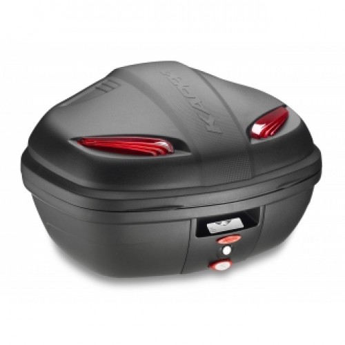 Top Case com capacidade de 47 litros, em cor preta e equipado com refletores vermelhos. Base Universal K628 incluída.
